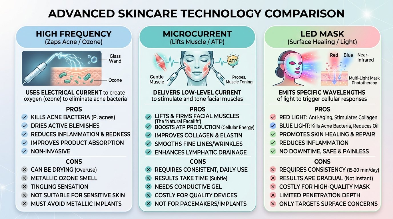 Verdict: If your primary concern is active acne, sudden breakouts, or killing bacteria, you need the high frequency wand benefits. If your primary concern is sagging muscles, you need Microcurrent. If you want passive, hands-free anti-aging, go with LED.