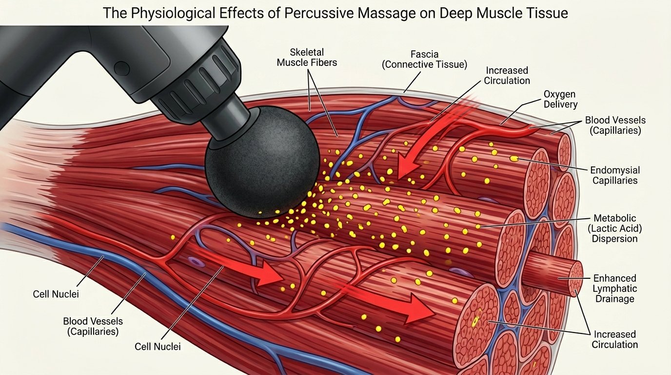 2. Blood Flow (Hyperemia): The physical impact creates friction and heat. This dilates blood vessels, flushing fresh oxygen and nutrients into the tissue while flushing out metabolic waste (like carbon dioxide).